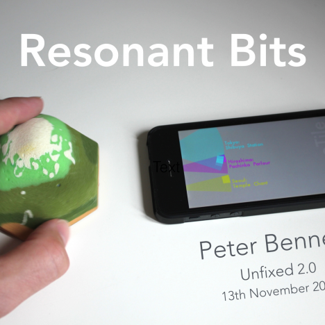 Giving a talk on Resonant Bits tomorrow as part of Unfixed 2.0 in the Pervasive Media Studio. Slides available as html (with video) or pdf
