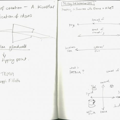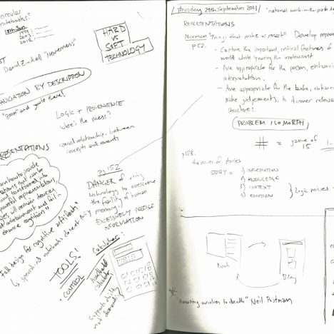 [right page] A few design space parameters. Speed of interaction. Speed of reading. Business-like or game-like? [left page] Conversation in pub with Henry. This was an actual transfer of ideas using the…