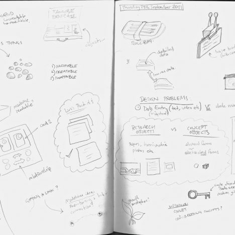 Lots of object based sketches on these pages. Bulldog clips card things. Containment of non-machine readable information with a header. Luc’s post-its. Concept cards. [middle left] First sketch of the relationship calculator.…