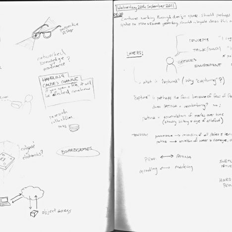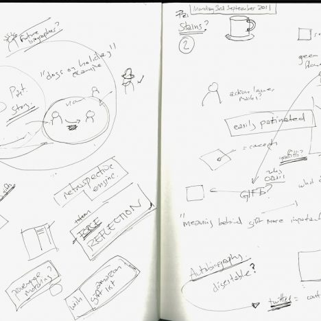 [top right] Using actual patina (such as coffee stains) as a basis for an interface. [top left] Trying to work out where ‘meaning’ enters the picture. Interesting conversation developed around the concept…