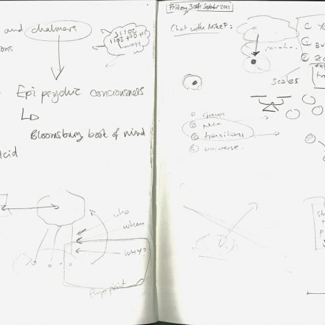 [right page] Doodles around a conversation with MikeF about the ideas so far. I can’t quite remember what the scales idea was, but I remember it making sense at the time… [left…