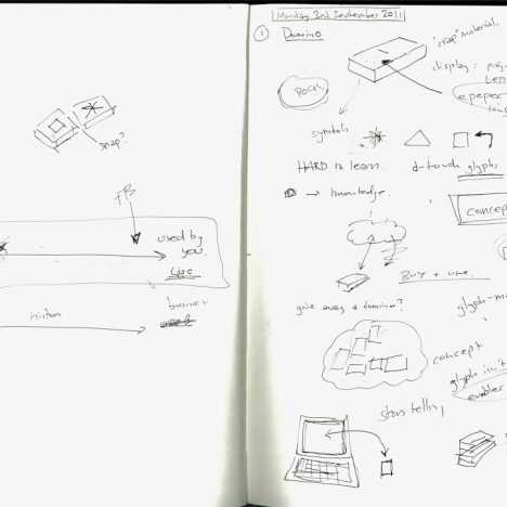 Exploring the domino concept. Can abstract glyphs on dominos (or a device such as a Siftable) be used as a basis of exploring and combining concepts? [left page] Design space scale for…