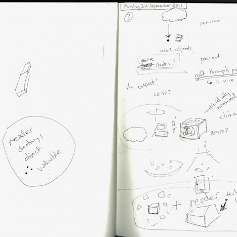 [top right] Service based concept. An object is 3D printed and delivered to your door from ‘the provenance cloud’ [left page] If the object you are reading is slowly worn and destroyed…