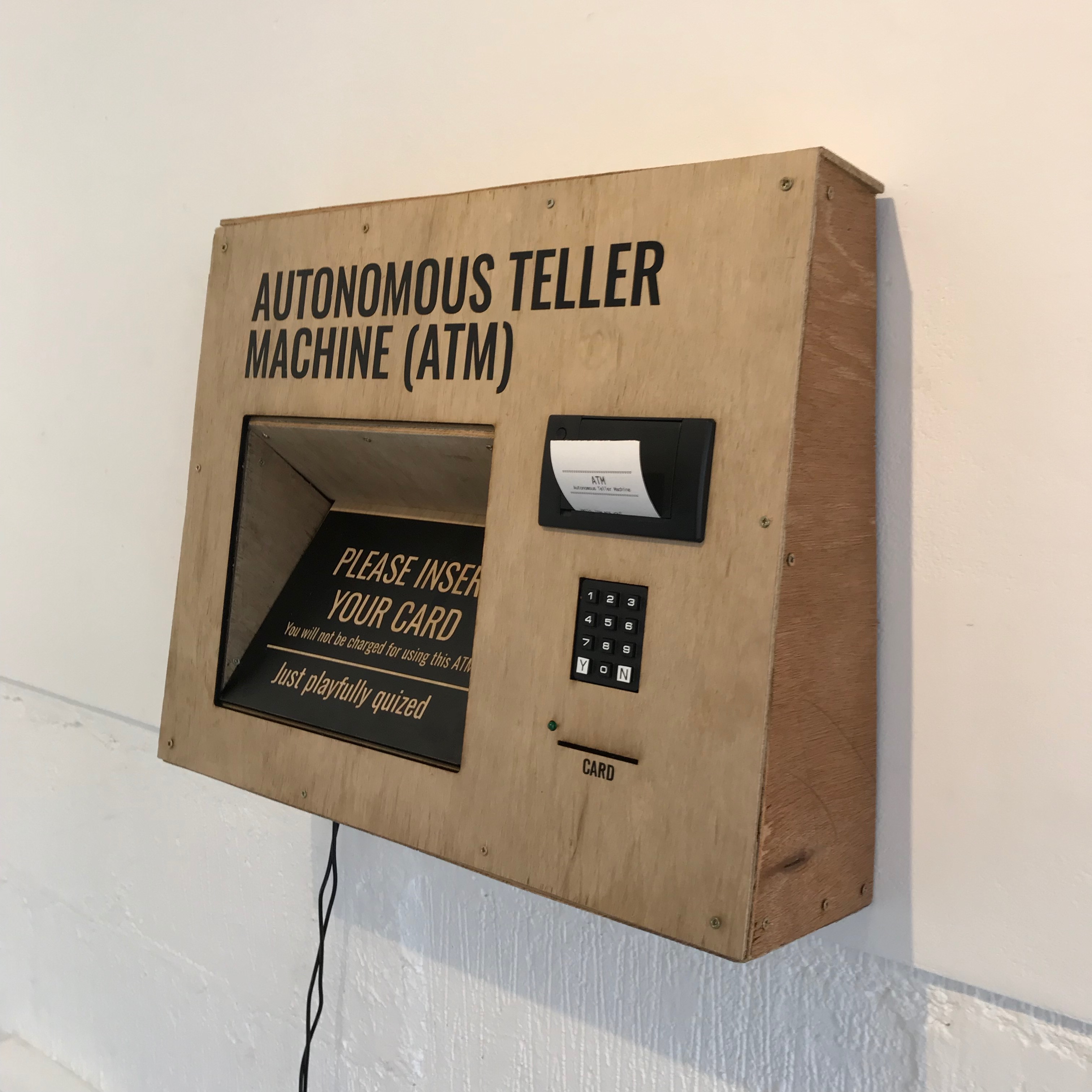 ‘Autonomous Teller Machine’ (ATM), is a collaboration between myself and artist Lara Luna Bartley, marking ten years since the global financial crisis and bailouts which followed by inviting audiences to reflect on this historic event. This temporary participatory intervention in the form of an ATM was exhibited as part of the Moneytree Exhibition in Bristol and at the Plymouth Art Weekender in September 2018.