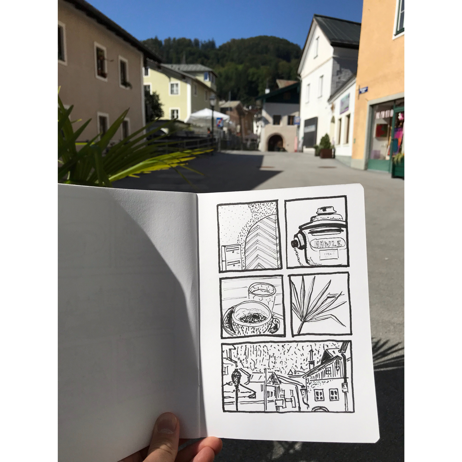 While in Austria at Ars Electronica and now Schmiede, I’ve been keeping a sketchbook of ‘coffee-break sketch notes’. By dividing up the page into comic book style panels I’ve found that it’s then easier to sketch just a few very small details rather than trying to draw a whole scene. As well as keeping my hand in, it’s been a useful way to take notes during talks.
