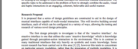 Have completed my 3 month review. You can download the full pdf file from: www.petecube.com/blog/documents/3-month-review.pdf This sums up my current research proposal, and lays out a very rough plan of what I need to do over the next year. More exciting is the new title for the research. The old one was”Techniques for analysis of multi-modal sensor data for gestural control systems.” The latest version is: