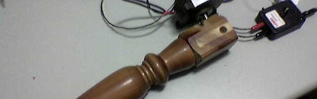 A very very rough prototype of a new instrument which may resemble an edge-trimmer has been made. So far this consists of an ergonomic handle (not a chair-leg!) connected to a magneto-rheological-fluid brake controlled by an Arduino board. Basically, the brake is switched on and off rapidly causing the handle to vibrate when pushed back and forth. A potentiometer connected to the Arduino allows the user to simultaneously change the frequency of the pulses, and hence the pitch of the note produced.