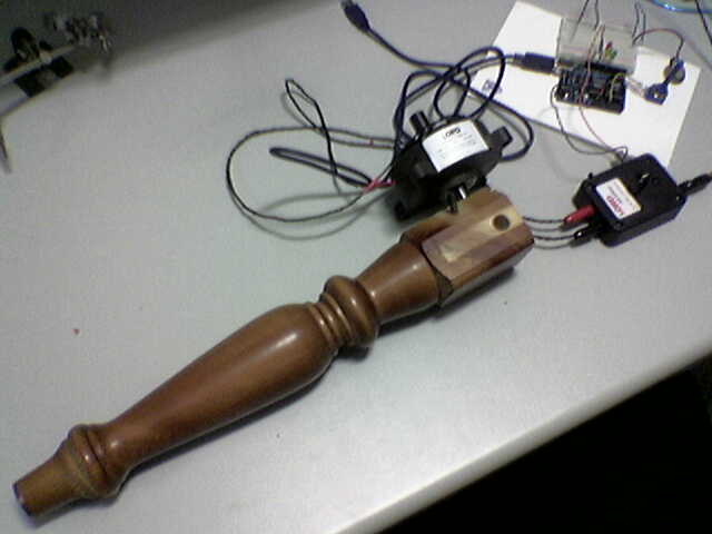 A very very rough prototype of a new instrument which may resemble an edge-trimmer has been made. So far this consists of an ergonomic handle (not a chair-leg!) connected to a magneto-rheological-fluid brake controlled by an Arduino board. Basically, the brake is switched on and off rapidly causing the handle to vibrate when pushed back and forth. A potentiometer connected to the Arduino allows the user to simultaneously change the frequency of the pulses, and hence the pitch of the note produced.