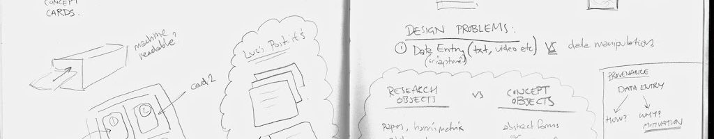 Lots of object based sketches on these pages. Bulldog clips card things. Containment of non-machine readable information with a header. Luc’s post-its. Concept cards.