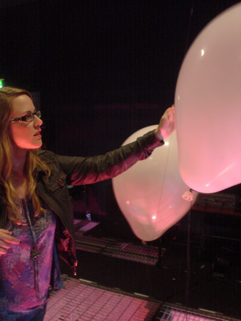 Helped Tom Davis install his piano-wire, balloons, motors and piezo installation in SARC‘s sonic lab. Piano-wires were strung vertically between the floor panels and the lighting-rig each with a balloon attached to act as an amplifier. Each balloon had a piezo (contact mic.) attached to it which were used to drive the motors to pluck another balloons string. Complex feedback occurs when a balloon or string is touched by the audience.