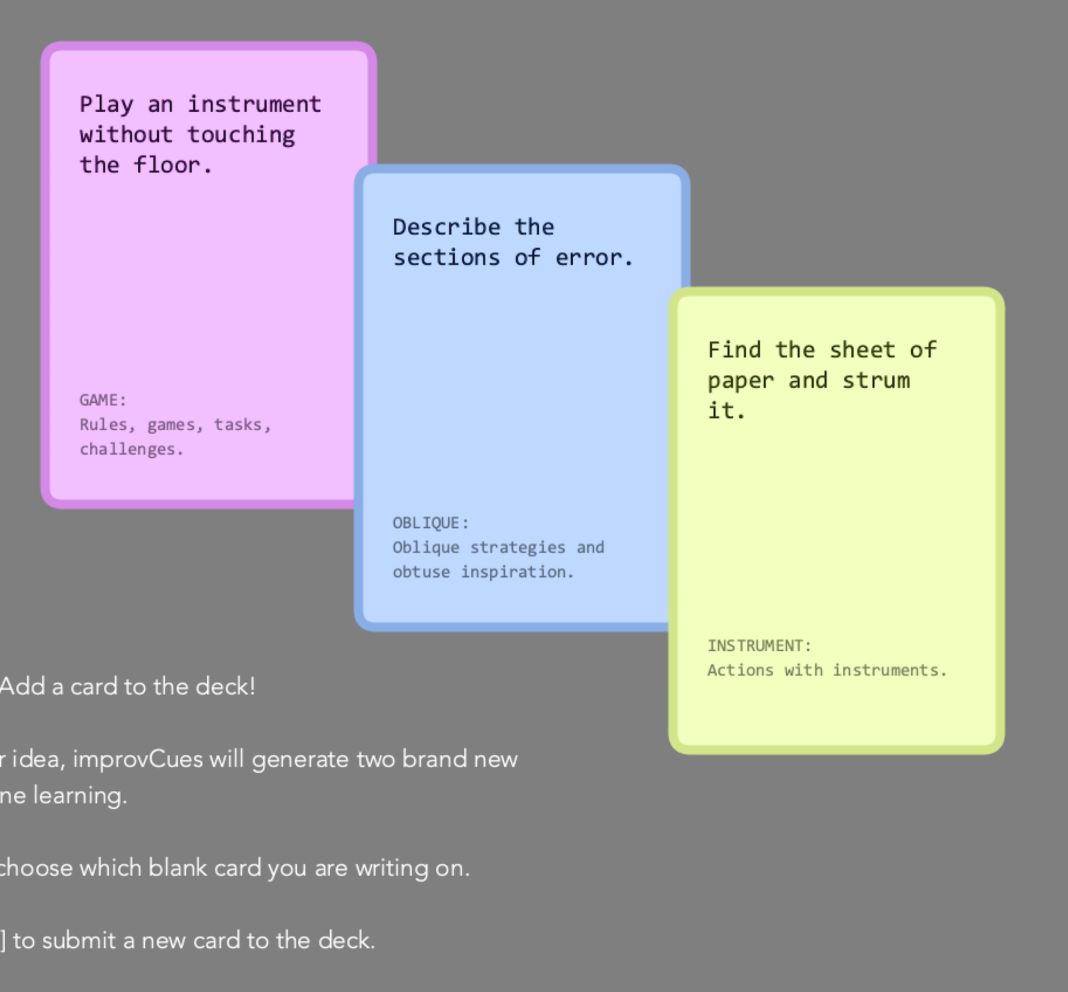 I’ll be presenting an installation “improvCues” on Wednesday 11th March throughout the day. A machine learning mediated improvised music cue system that builds upon the Project Idea Bot.